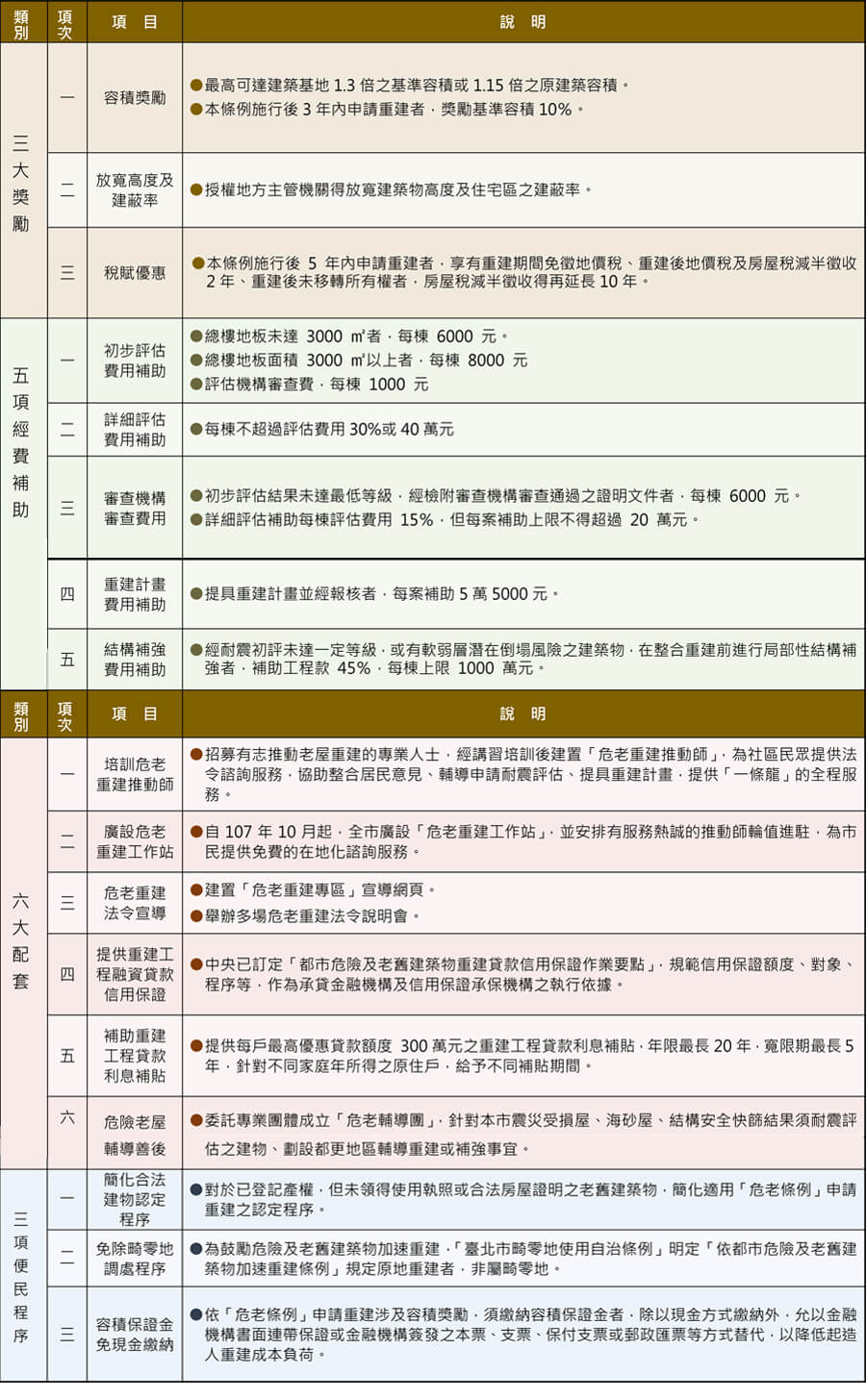 一、三大獎勵:容積獎勵、放寬建蔽率與建築高度、稅賦優惠